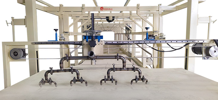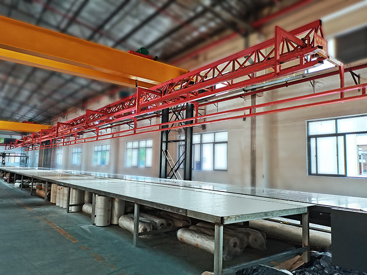 泡綿熟化箱和輸送機:熟化箱在泡沫板周圍形成一個完整的外殼,帶有頂板、側壁和輸送機板條。輸送機電機還配備有交流速度驅動裝置。側墻可在1.2m~2.4m范圍內調整。輸送機的長度為18米。